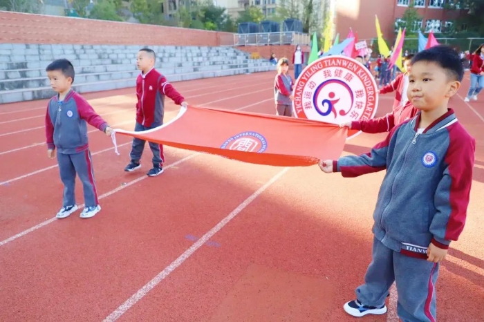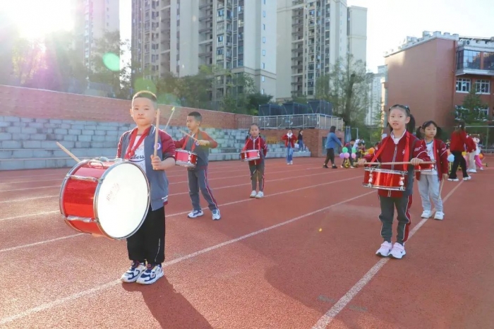 由大八班孩子组成的鼓号队,他们一个个英姿飒爽,神采飞扬,他们踩着时代的强音,敲出当代幼儿的风采,完美的体现出天问小朋友们“阳光、自信、健康”的精神风貌。