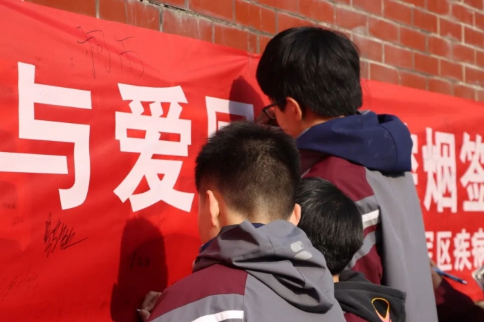 活动现场,点军区疾控中心的闫主任带领全校师生共同观看控烟知识宣传展架并宣读倡议书,向全体师生发起倡议,树立社会责任感和使命感,做无烟校园的小卫士,为建立无烟的美丽校园贡献力量!随后,同学们纷纷在“无烟佳节,与爱同行”的横幅上郑重的签上了自己的名字。
