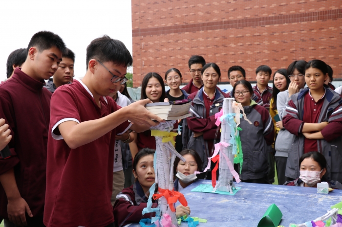 在最激动人心的测量环节,答案即将揭晓,量高度,测承重,同学们屏住呼吸,慢慢的将一本本书放上纸塔,每次成功后,现场就会爆发一阵阵欢呼。当然也有只注重外观的小组,将纸塔设计成精美的小鸟形状,导致无法承重让大家惋惜不已!