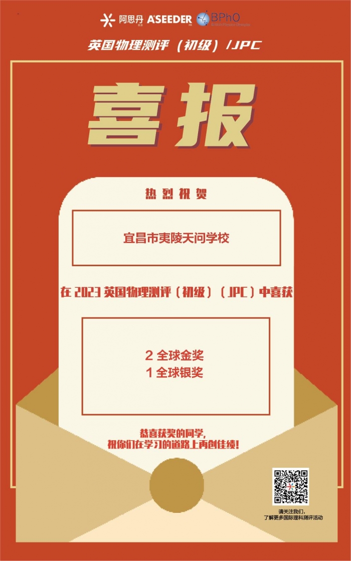 在师生共同的努力下,新年的第一份喜报来了!夷陵初中八年级3名学生凭借扎实的功底和无限的潜力在2023年JPC英国物理测评(初级)喜获佳绩:2个全球金奖(Global Gold)、1个全球银奖(Global Silver)。