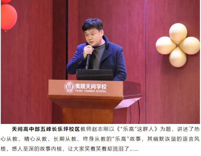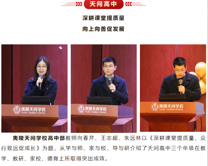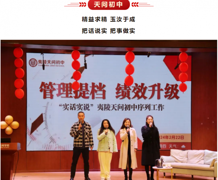 夷陵天问初中教师团队创新表现方式,根据真实案例改编,以《管理提档,绩效升级》为题,用“实话实说”的形式演绎了夷初人完善管理制度、壮大教师队伍、提升教学质量、增强治理能力的探索过程,表达了天问人“自主求索,追求卓越”的决心。
