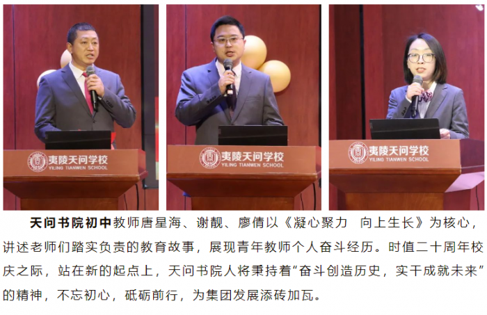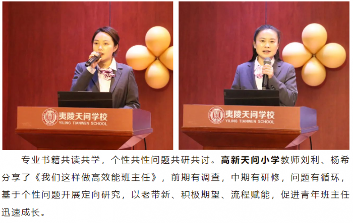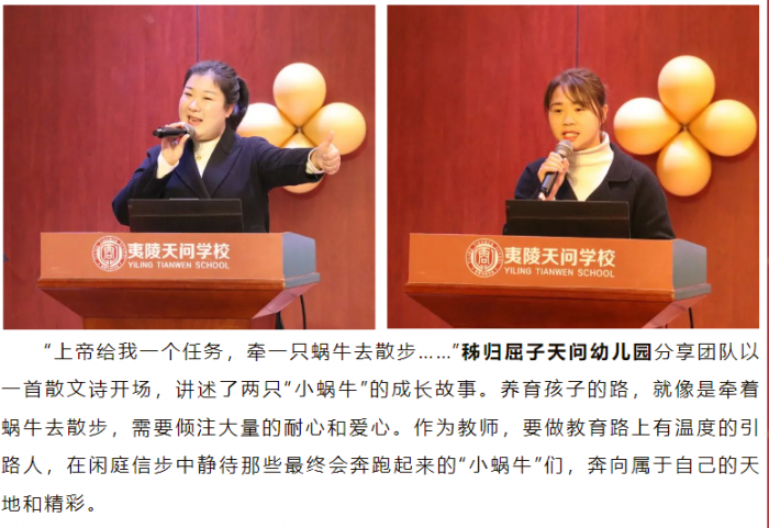 夷陵天问小学“老教师”胡多多和“新教师”姜怡晨以《 求索讲堂,助我成长》为题,讲述了夷小教师的专业成长之路。“求索讲堂”为新教师提供拿来就能用的教育教学方法、班级管理策略,让新教师快速成长。老教师在“求索讲堂”中,通过研究真问题,获得真发展,迎来新的发展机遇。求索讲堂,为教师成长赋能,为课堂提质增效。