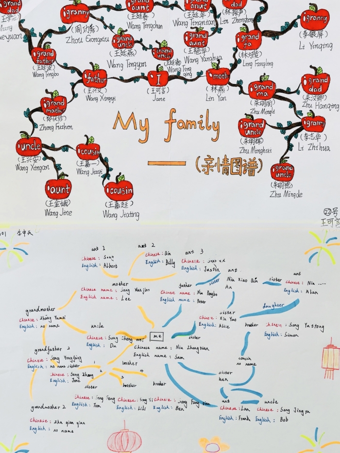 爷爷和姑姑是什么关系?奶奶的哥哥怎么称呼?你是否一到走亲访友时就会懵圈,不知怎么称呼亲友。为了缓解这种尴尬,让孩子们对自己的大家族更了解,六年级实践作业与英语学科相结合,制作中英文亲情图谱。整个实践活动家庭成员全参与,从成员列表,导图梳理,访问亲友了解亲情故事,到印制图谱并发放给亲朋好友,最后在校分享,这一系列活动增进了家族内部的彼此了解和信任,传承了亲情,也激发起对长辈的敬意与怀念。