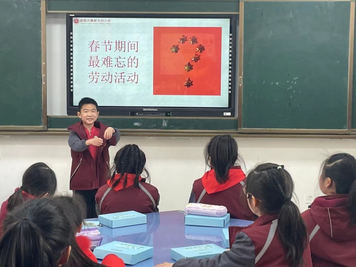 【劳动】通过你动我猜的小游戏导入,让学生用动作表演来分享自己在寒假里印象最深刻的劳动活动,其余同学认真看后举手回答,不少同学猜到了剪纸、拖地、扫地、包饺子等劳动活动,课堂一片欢声笑语。