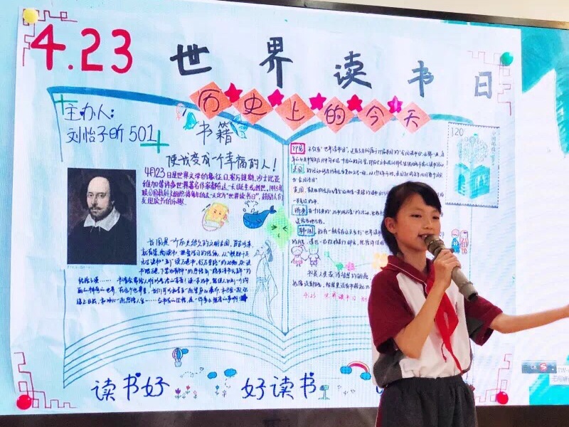 501班刘怡子昕同学用微演讲的方式讲述了“历史上的今天”之“世界读书日”,给全校师生普及了读书日的知识:4月23日是西班牙文豪塞万提斯的忌日,也是莎士比亚出生和去世的纪念日。她讲了多个国家庆祝读书日活动的做法——我们要读好书,好读书,做幸福的人。