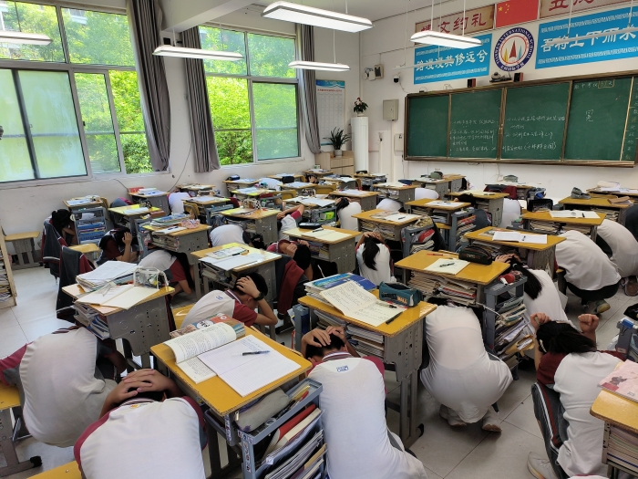 5月13日,夷陵天问学校举行了防震减灾应急疏散演练活动。随着警报声响起,上课教师迅速组织同学们在课桌下进行躲避,随后,有序撤离至安全地带。