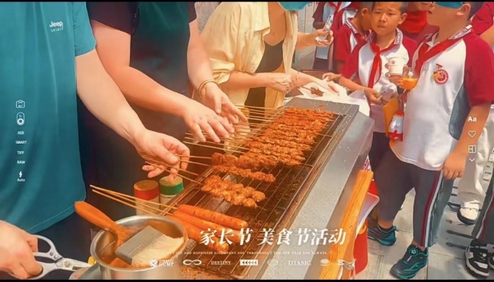本次活动,所有的美食都在各班的教室内进行先加工。每个教室里都有家长志愿者和小小美食家们忙碌的身影,大伙正在用心为大家烹制美味的食物,而更多的美食则躺在推车里整装待发。更有家长将烧烤架搬了过来,现场变成了一场烧烤大餐。