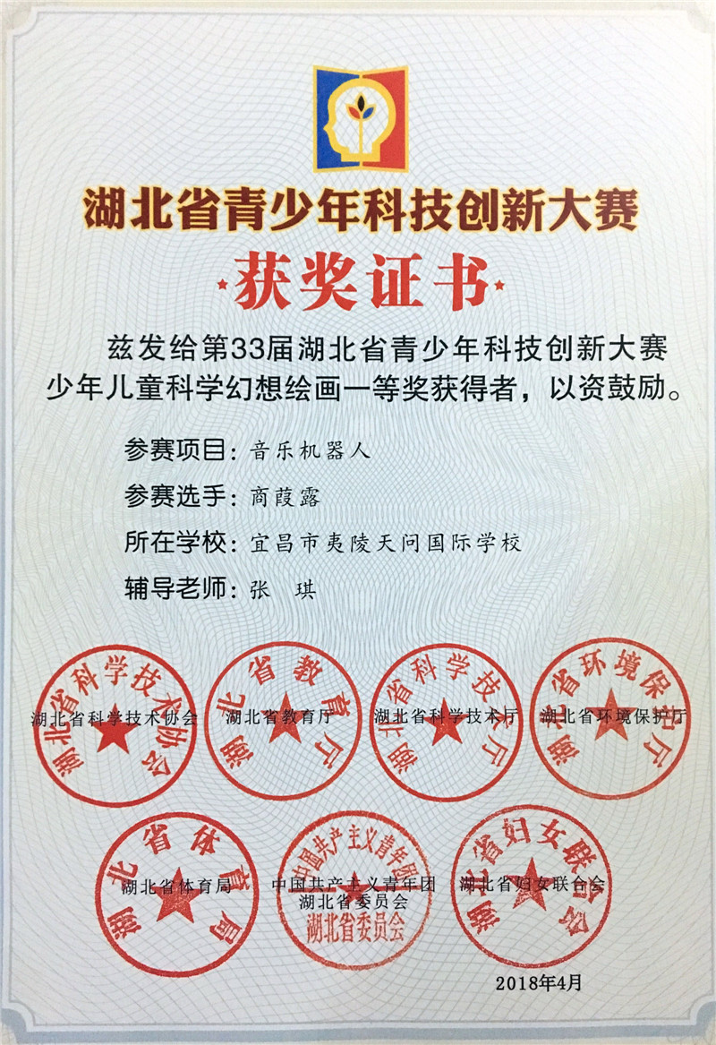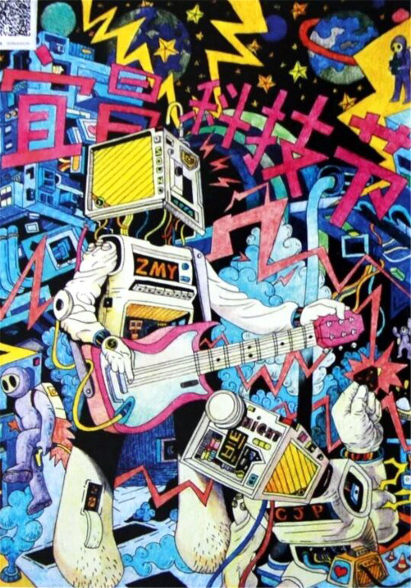 据辅导老师张琪介绍,商葭露同学酷爱绘画,也非常勤奋,是学校美术社团的积极分子和优秀学生。宜昌市第十六届青少年科技节中,商葭露同学在张琪老师的辅导下完成了科幻画《音乐机器人》,该作品构思巧妙,色彩绚丽,画面动感,内容丰富,将科技色彩和超强想象力充分融合,同时凸显了作者深厚的绘画功底,作品一举夺冠,并被推送至湖北省和全国青少年科技创新大赛,获得一等奖的优异成绩。