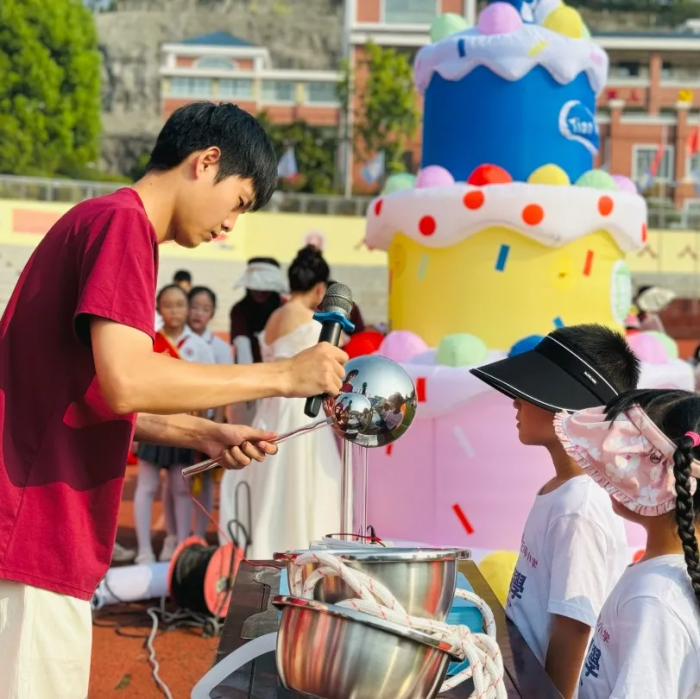 随着国旗与校旗的冉冉升起,小寿星“天问一号”伴随着激昂奋进的乐曲从后台登场。与“天问”同龄的天问学子郑钰涵同学来到了现场,与全校师生共同唱响“生日祝福歌”,为“天问”献上最真挚的生日祝福。