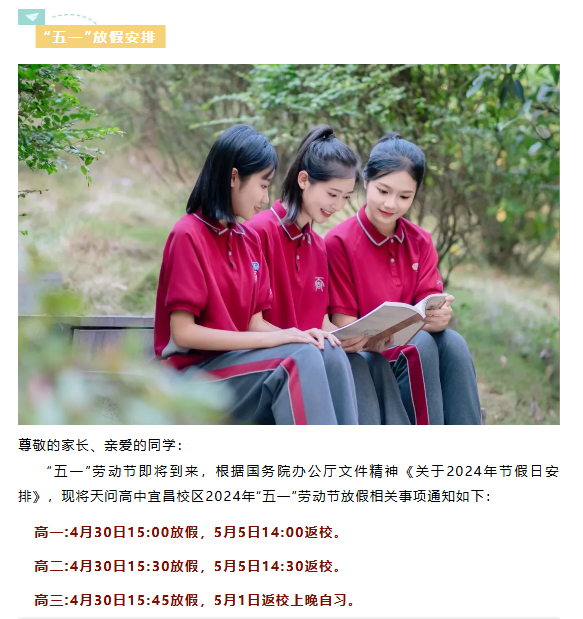 天问高中宜昌校区2024年“五一”劳动节放假通知及安全温馨提示