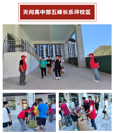 8月31日下午,天问高中部五峰长乐坪校区的高一新生到校。承载学生的通勤车需要老师跟车,自驾车需要有人引导行进路线,停车需要人指挥,学生和家长到教室到寝室需要人引路,校服发放需要人搬运和指挥,这一切斗离不开咱们的志愿者们,哪里有需要,哪里就有“小红帽”的身影!9月1日上午开学典礼之前,咱们的志愿者们忙着清理运动场垃圾,布置会场等!