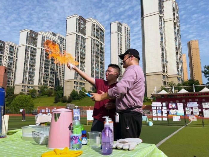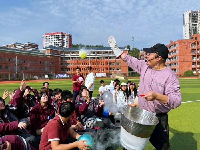 金秋时节,天问国高迎来了激动人心的科技秀。同学们品尝液氮薯条、液氮棉花糖的美味,惊叹火焰掌的神奇,体验液氮炸弹的威力……在一个个小实验中感受科技的魅力,点燃探索的热情。