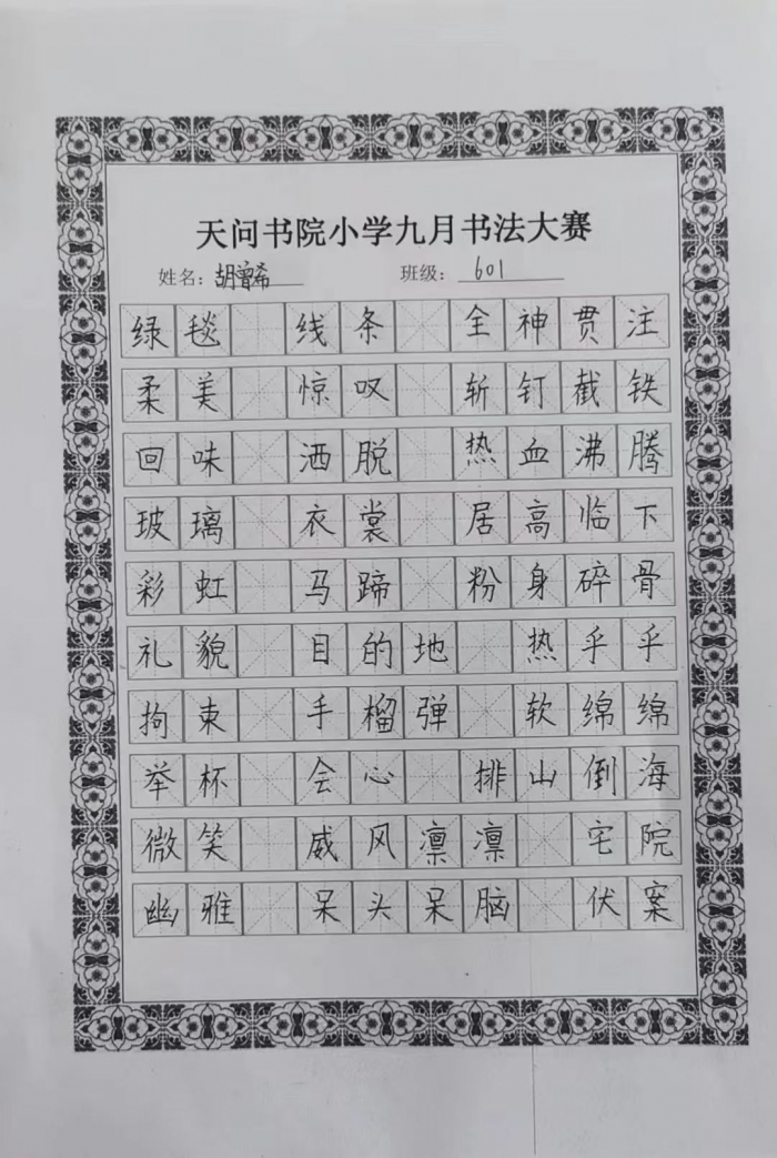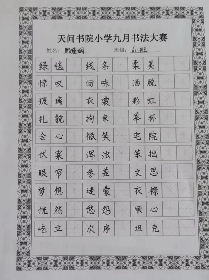 一笔一画皆是情,一字一词都有意。同学们辛勤的付出换来喜悦的收获每一笔,每一画,都有独特的肌理与线条;每一字,每一词,都有标致的结构与映衬。一幅幅作品美观大方,或清秀雅致,或舒展开阔,彰显了学生们良好的书写习惯和深厚的书法功底。