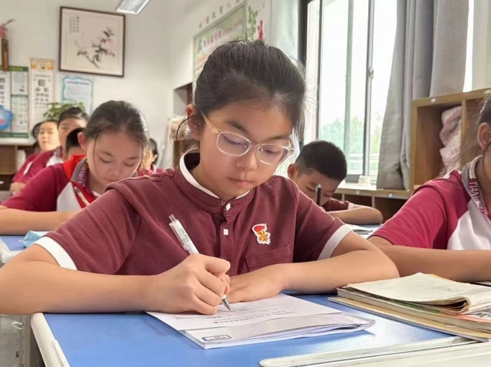 学生低头沉思,认真书写,一个个单词跃上笔尖。一段段优美的英文从笔尖流淌,一张张纸上开出了花,落“英”缤纷。