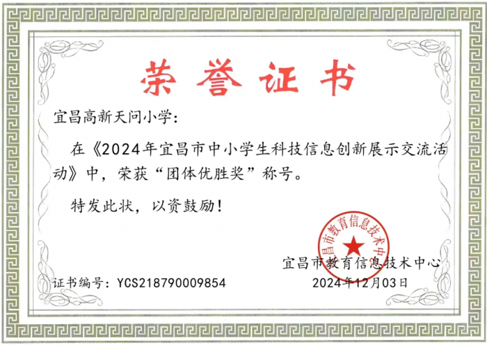 这是继高新天问小学作为“宜昌市首批中小学科学教育实验先行校”,在2024年宜昌市中小学生科技信息创新展示交流活动”中荣获“团体优胜奖”之后,再传喜讯。斐然成绩的背后,既是天问教师张弛有度的悉心指导,也是天问学生日复一日的辛勤训练。