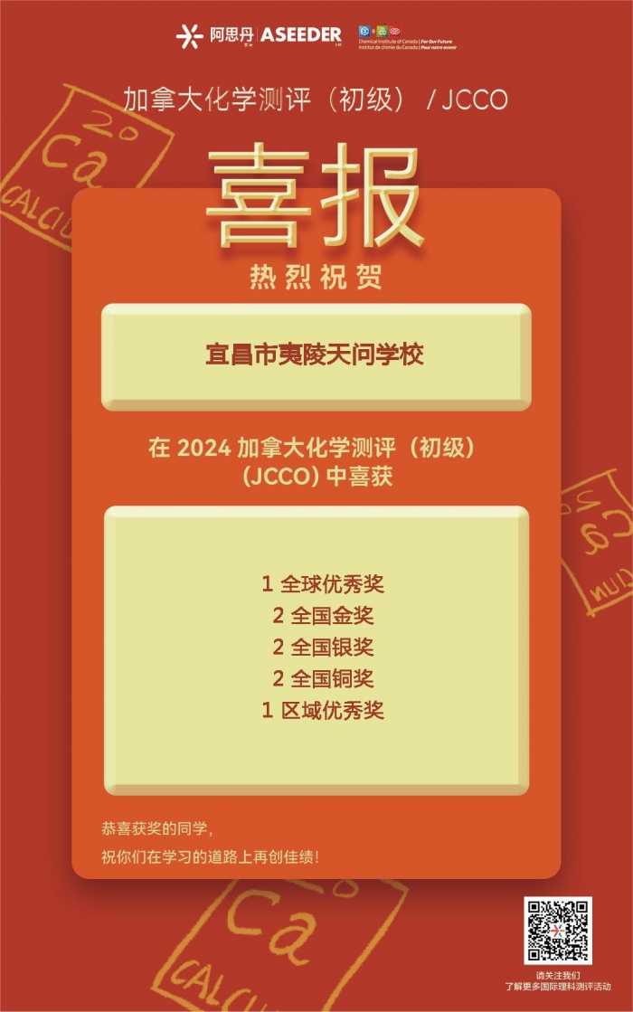 近日,2024年加拿大化学测评(初级)(JCCO)成绩揭晓,天问国高学子再传喜讯。