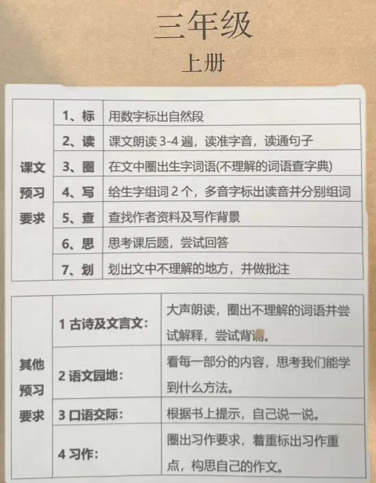 如何预习呢?我引导学生对方法进行了梳理。从字词、课文内容、课后习题三个方面着手,梳理出了预习“七步法”。1.大声朗读课文2遍,标自然段并把不认识的字圈出来。这样做的目的是让学生读第一遍课文,对课文有初步的印象,知道课文有多少个自然段,并明确自己有哪些字不认识。2.借助工具书扫清文字障碍(包括不认识的字,不懂意思的词),并在词语的空白处批注意思。这一步的目的是让学生弄清楚词语的意思,从而减轻理解上的难度。3.预习课后生字(生字条里的生字组一个词,田字格里的生字组两个词,梳理多音字、形近字并组词)。这样做是为了让学生提前学习字词,注音、组词就是提前认、提前运用。整理梳理形近字、多音字,哪些字形相似,容易写错,哪些字有多种读音,是哪几种读音......课堂上老师针对性讲解和总结,提高课堂效率。4.读课文并给课文划分段落,用简短的话概括课文主要内容。给课文分段并概括课文主要内容是三年级的一个难点,这一步的目的是让学生在尝试分段的时候,能前置性思考课文的结构、写作的顺序等,能初步感知课文主要内容和结构。5.读课后习题,并尝试在文中找答案。课后习题是教学的重要参考依据,让学生提前关注课后习题并试着解决,其实就是提前了解课文的重点和难点。6.再读课文画出你觉得很有意思的句子做批注。这一步是要求学生学会品析好的句子,什么是好的句子,为什么有意思?给学生提供范例,如比喻句,拟人句,排比句等。学生提前思考并在课堂上进行分享,这样既品析了句子,也进行了语言训练与积累。7.默读课文后至少提出两个问题。这是最后一步,看似简单,但实际很难,既讲究提问的方法,也检验学生初步预习后对课文内容的掌握情况。