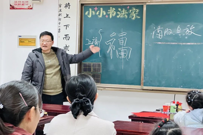 王老师从何谓“五福”谈起,深入浅出地讲解了“福”字的深刻含义,还亲自示范,现场指导大家如何写好一个“福”字。在他的带领下,书法社团成员以及部分教师子女纷纷拿起毛笔,自主练习,创作属于自己的书法作品。活动现场墨香四溢,大家沉浸在书法的艺术魅力中,共同迎接新春的到来。