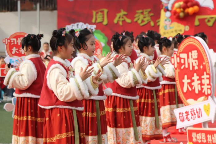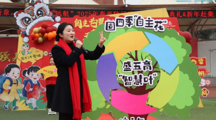 在“灵蛇启岁鸿运当头”环节,学校回顾了过去一年在“自主学习”与“五育融合”中的探索,并正式启动“固本年”计划。本命年家长代表身着红色盛装登台挥手致意,与“锦蛇昂首扬帆起航”环节中少先队员的庄严升旗仪式交相辉映,展现家校社协同育人的坚定信念。新教师与插班生则在“银蛇纳福共绘未来”中携手走过“成长门”,以鲜花与掌声迎接教育新力量的加入。