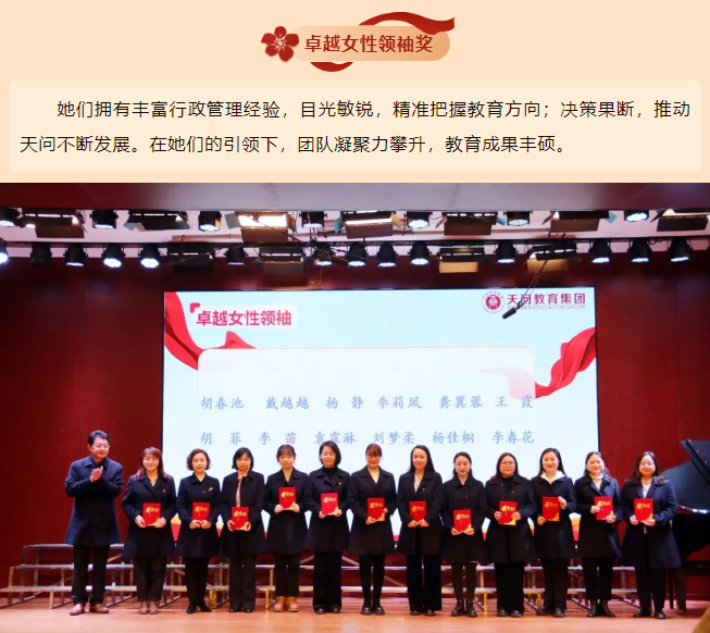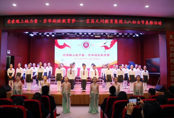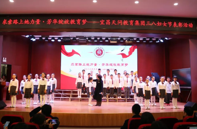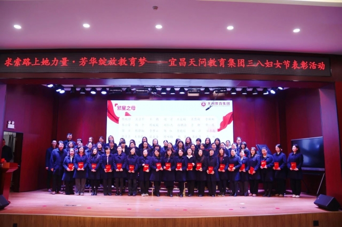 春意盎然,万物生辉。为庆祝第115个国际妇女节,弘扬新时代女性教育工作者踔厉奋发、躬耕教坛的榜样力量,3月6日,天问教育集团以“求索路上她力量 芳华绽放教育梦”为主题,在夷陵天问学校报告厅举行了三八节表彰活动。