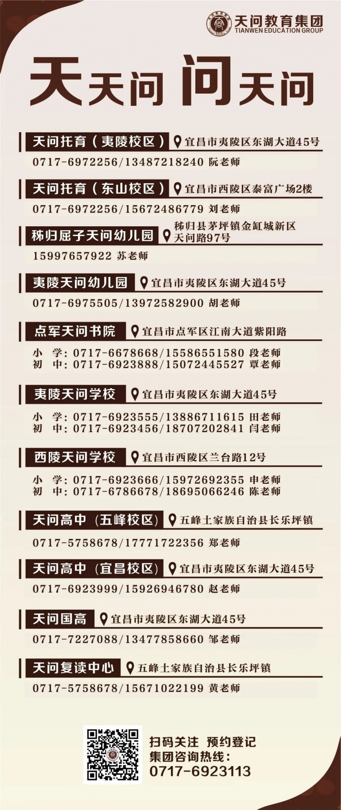 宜昌天问教育集团是屈原文化传承的品牌学校,公益为先,文化铸魂。秉持初心助力点军发展,先后托管了市28中和点军区实验小学;助力乡村振兴,托管五峰长乐坪中小学。