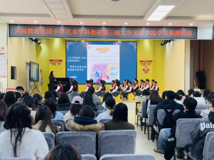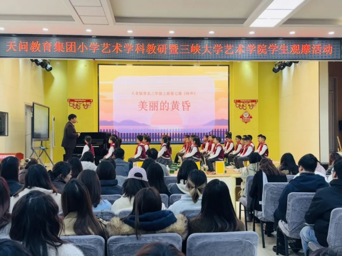 3月13日,西陵区天问学校报告厅内琴韵悠扬,书画室中翰墨飘香。作为三峡大学“教育实践基地”的重要合作项目,天问教育集团与三峡大学艺术学院联合举办的2025春季学期艺术学科联合教研暨毕业见习课活动圆满举行。本次活动通过“双课堂+双互动”的创新模式,搭建起基础教育与高等艺术教育深度对话的桥梁。活动当天,来自三峡大学艺术学院的120名音乐、美术专业学生与天问教育集团旗下各校区的艺术教师齐聚一堂,深度研讨了四节精品艺术课。