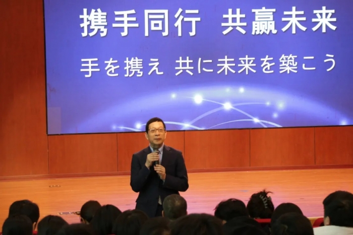 随后,木村研治理事长详细地向家长和同学们介绍了JCL外国语学院的学校环境、地理位置、升学成绩及课程设置,学校以优质的教学质量和师资阵容,长久保持和创造了全日本同类学校的多项第一,为同学们的名校升学保驾护航。