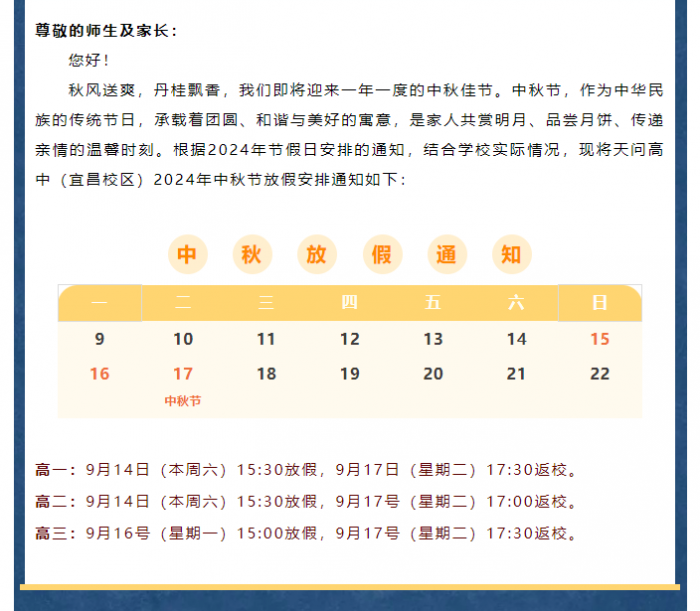 天问高中(宜昌校区)2024年中秋节放假通知及安全温馨提示
