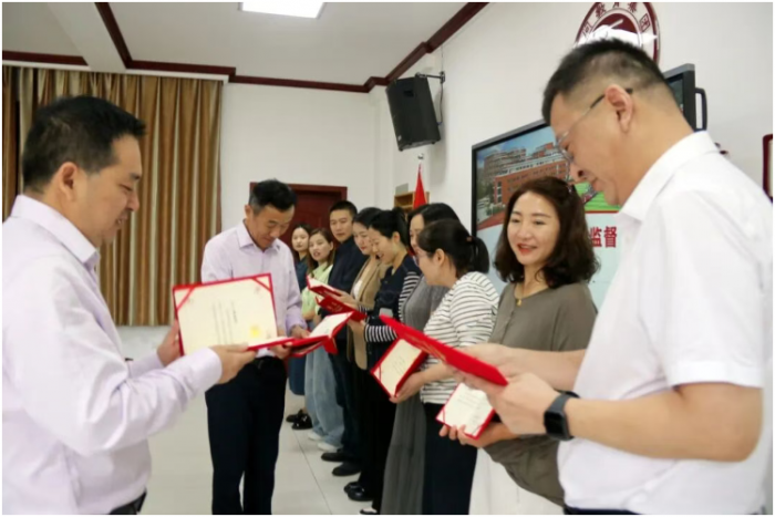 夷陵天问学校党总支书记黄迎宾与校长彭灿共同为膳食监督家长委员会成员颁发聘书。鲜红的聘书承载着信任与责任,家长代表们双手接过聘书时,脸上满是郑重 —— 这不仅是一份荣誉,更是对全校学生健康成长的承诺。