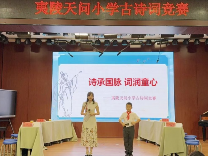 当 “床前明月光” 的童声飘进晨读时光,当 “大漠孤烟直” 的豪情落在课后笔记里,诗词的韵律早已融入天问学子的日常。9月25日,夷陵天问学校橘颂厅内,“诗承国脉 词润童心” 诗词大赛如期而至——这不是一场偶然的盛会,而是集团十余载诗教传统的又一次绽放,是 “天问” 之名中求索基因的生动延续。经校级海选脱颖而出的点军天问书院小学、夷陵天问小学、西陵区天问小学、点军实验小学四校学子,带着数月积淀与往届赛事的精神传承,站上了决赛舞台。