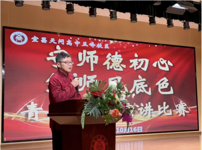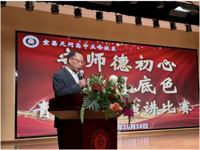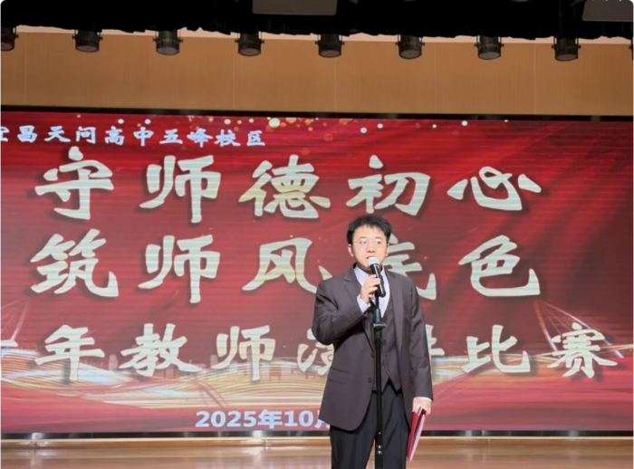 活动开场,天问高中五峰校区副校长邓士木率先登台致辞。他直言,青年教师是学校教育事业的 “新鲜血液”,而师德师风则是教师的 “立身之本”,本次比赛不仅是校区“风纪整治月”的关键环节,更是青年教师交流成长的“练兵场”。