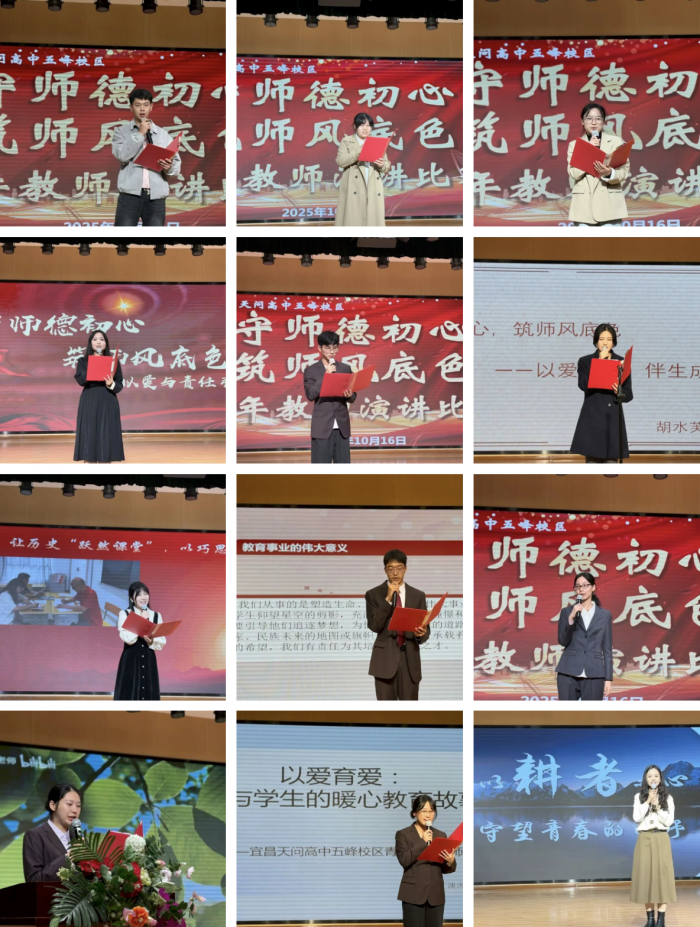 10月16日晚,天问高中五峰校区“守师德初心,筑师风底色”主题青年教师演讲比赛在报告厅圆满落幕。13位青年教师登台亮相,用扎根教学一线的真实故事、饱含温度的育人感悟,为全校师生呈现了一场兼具思想深度与情感共鸣的 “师德盛宴”,也为学校“风纪整治月”专项教育活动注入了鲜活动能。