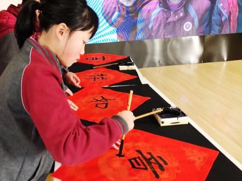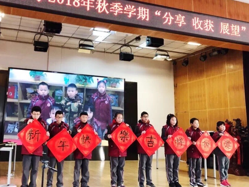 最让大家惊喜的就数孩子们的温馨祝福啦!大家一边聆听着屏幕上孩子们送来的祝福,一边欣赏书法社团孩子们的现场书写的新年“福”字,顿时暖意浸润心田。
