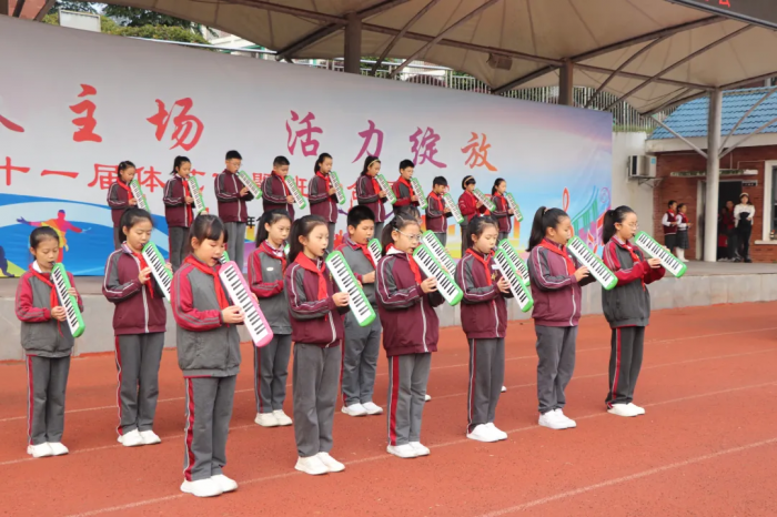 当口风琴社团的孩子们列队登场,《钢铁洪流进行曲》的激昂旋律从他们指尖流淌而出,悠扬的乐声瞬间为赛场注入了艺术的灵魂。尤为令人动容的是,来自口风琴校队预备队的小队员,经过两个月的刻苦训练,今天首次登台,肩负起奏响国歌的神圣使命。孩子们的展示让“体艺融合”的种子在每个人心中悄然发芽,并深深扎根。