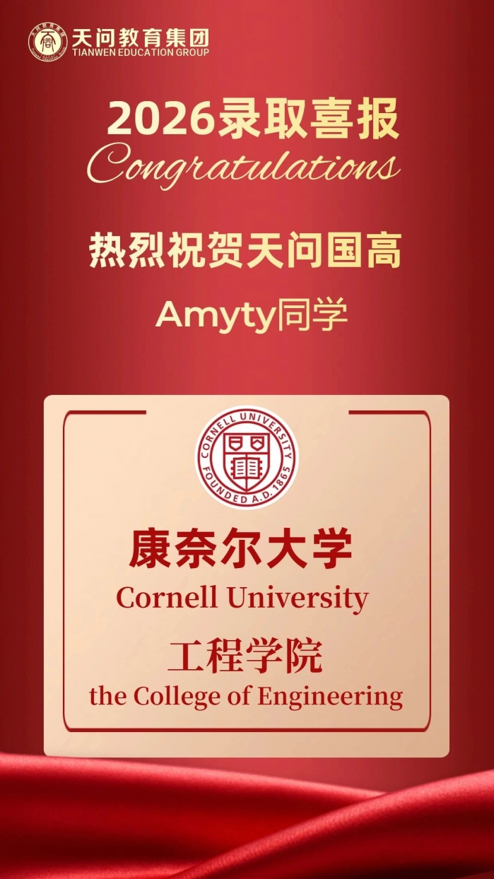 历史性突破!12月19日,宜昌天问国高Amyty同学斩获美国常春藤盟校康奈尔大学录取!这是截至目前,2026届早申湖北省唯一,同时也创造了宜昌地区近十年来首次有学生直通常春藤盟校本科的历史性纪录。这一消息不仅振奋了整个天问校园,也在宜昌教育界引起了广泛关注。