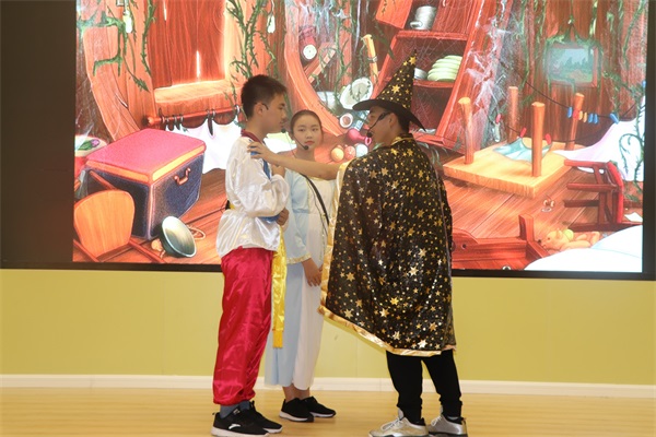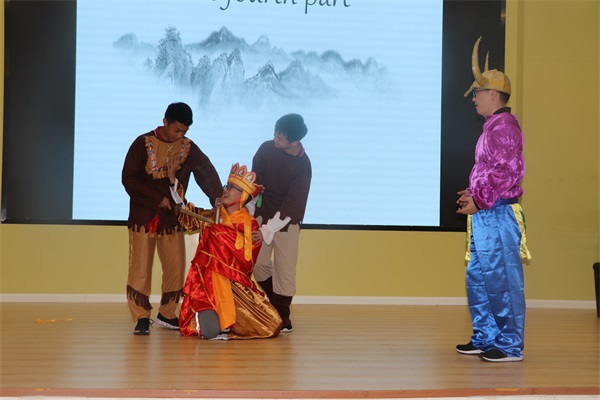 据悉,在前期不到两周的准备过程中,学生们一边进行紧张的地生备考复习,一边利用宝贵的休息时间进行排练。在紧张的学习氛围下,各班演出团分工协作,有小导演,有编剧,有的负责舞台背景,有的负责道具和服装。英语教师全程几乎不用“参与”准备过程,只用出现在他们需要的时候,帮助纠音和给出建议即可。在此次活动课程中,学生不仅展现出了良好的外语语言素质,而且也充分展现出了自主管理与团队协作的能力,很好地体现了天问的自主管理文化。