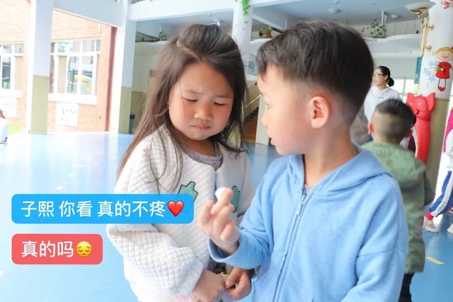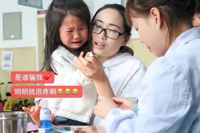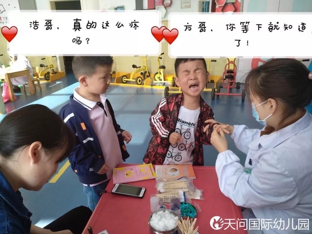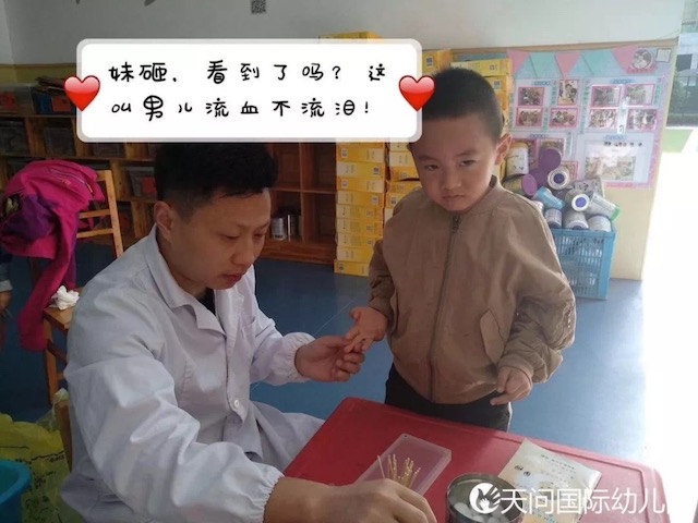 这个环节,是大部分孩子最害怕的。医生每扎一针,都发现孩子脸上凝重的表情。老师们贴心的把宝宝抱到自己怀里,不断地耐心安抚、夸奖。医生姐姐也非常友爱,一边鼓励着孩子,一边认真细致地检查、抽血。