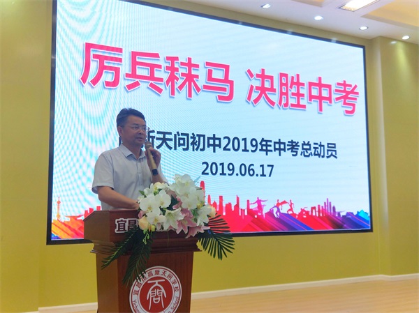 本网讯(通讯员 裴燕妮)烧玉要烧三日满,辨才须待七年期。三年磨一剑,利刃已成,只待六月试锋芒!2019年6月17日,高新天问初中九年级师生共同参加中考总动员大会。天问教育集团理事长、总校长高正华参加并出席大会,为新初九年级学子送来满满的祝福!大会由新初副校长伍月铭主持。