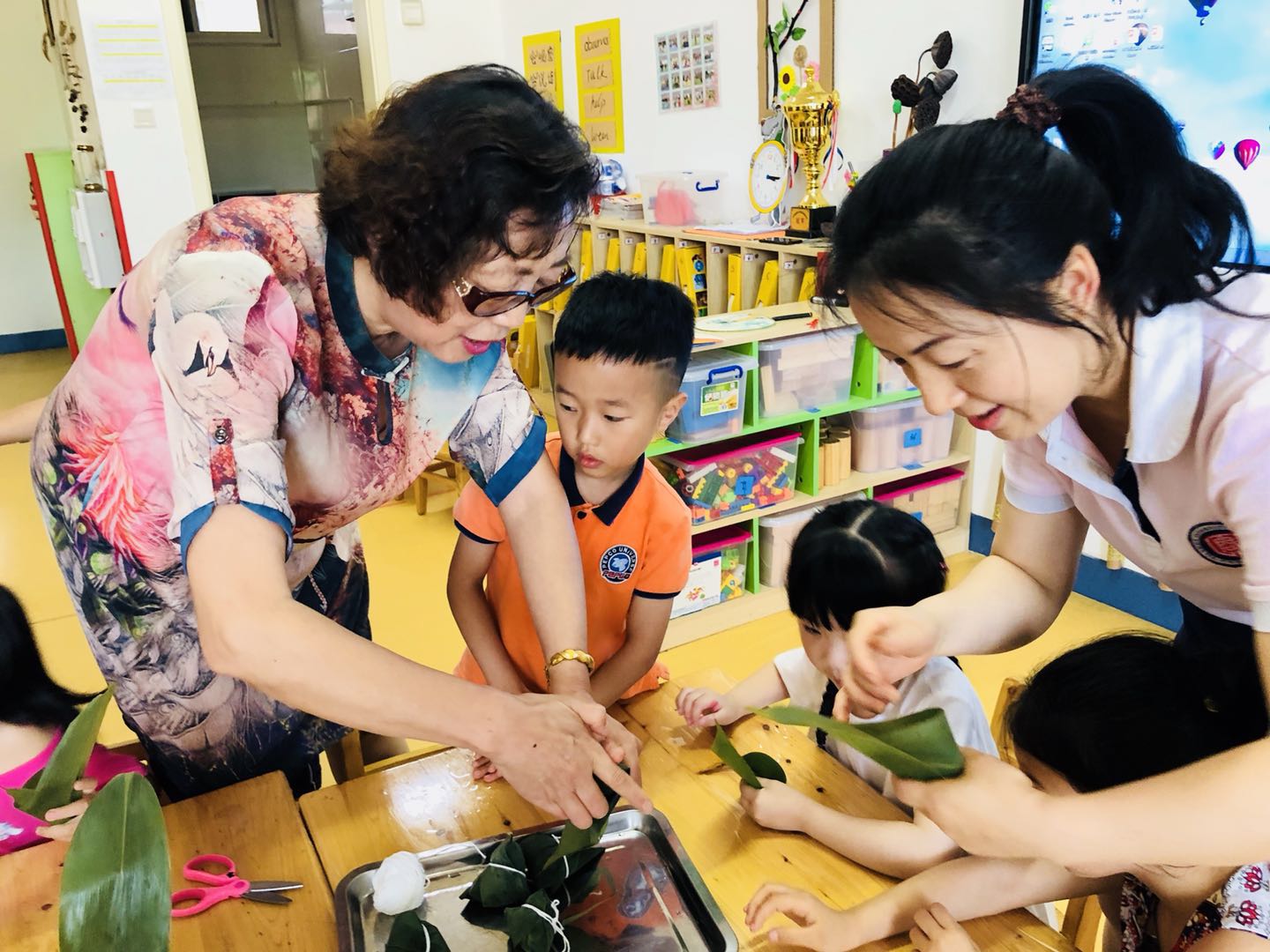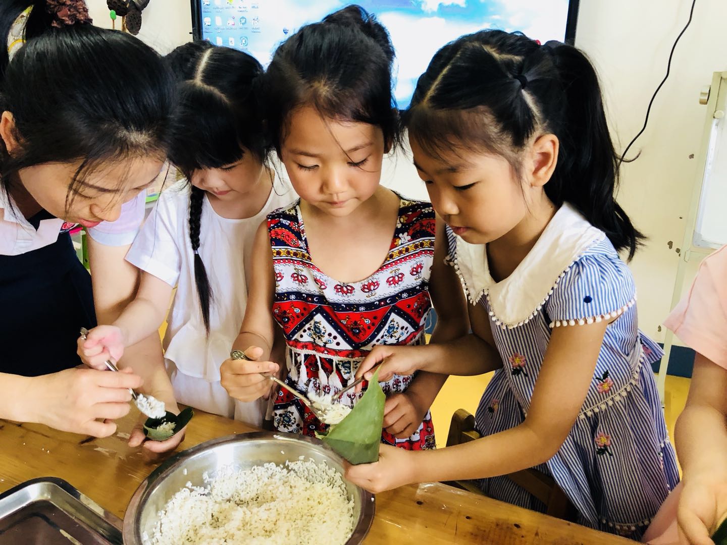 老师教我们包粽子