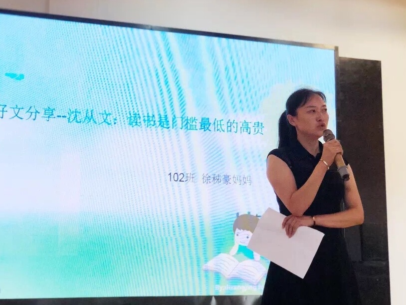 优秀传统文化是民族根,101班佘文灏爸爸对传统文化阅读有着独到的见解;102班徐秭豪妈妈“一日不读书便觉乏味”;501班刘昕子怡妈妈的“亲子阅读时光”让台下的双胞胎女儿幸福得落泪;601班万谦石妈妈分享的《人间词话,词话人间》引得掌声连连!