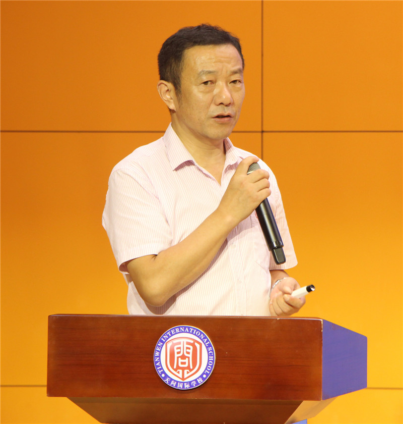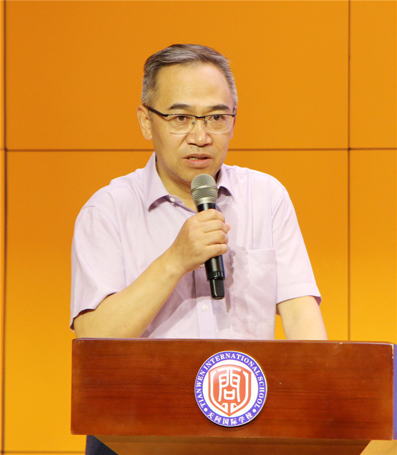黄迎宾校长从学校概述、特色、文化及内涵解读,到学校管理目标、自主教育管理体系、自主教育课程体系,与全体教师重温了天问的使命、愿景、价值观,以及其核心价值观的校本解读,衍生出天问国际初中“自主、求索、尊重、感恩、和谐、创新”的核心价值观和“守正出新,和合共生”的治校思想,并表达了天问国际初中始终用课程理念缔造自主教育的决心和信心。