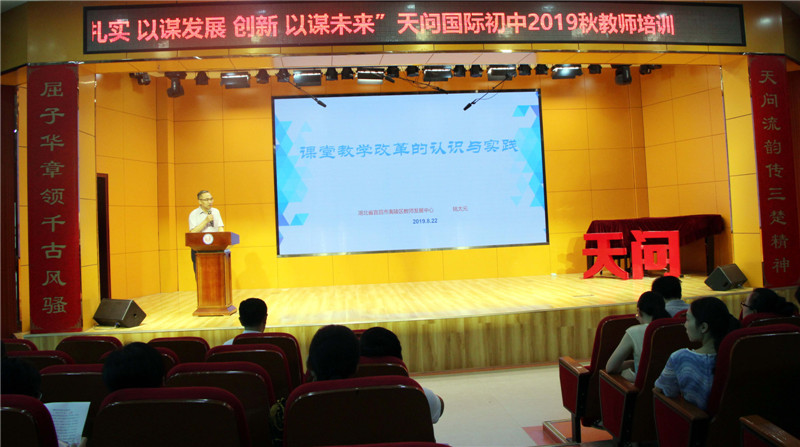 夷陵区教师发展中心姚太元主任,以《课堂教学改革的认识与实践》为主题,为老师们分享了诸多教师课堂教学设计策略、学校校本研修管理策略、学生综合素质评价策略、课堂教学学生评价策略等,大量研究背景资料的梳理、具体可行的实践方法的展现,让老师们认识到课堂教学应从技术层面上升到精神层面,将良好的师生关系放到教法与学法前,而教育最宝贵的财富便是自身认同和自身完整的教师心灵,同时也领略到了姚主任的课堂教学“八要素”与天问自主课堂的相通之处,真可谓“课堂改革,万变有宗”!