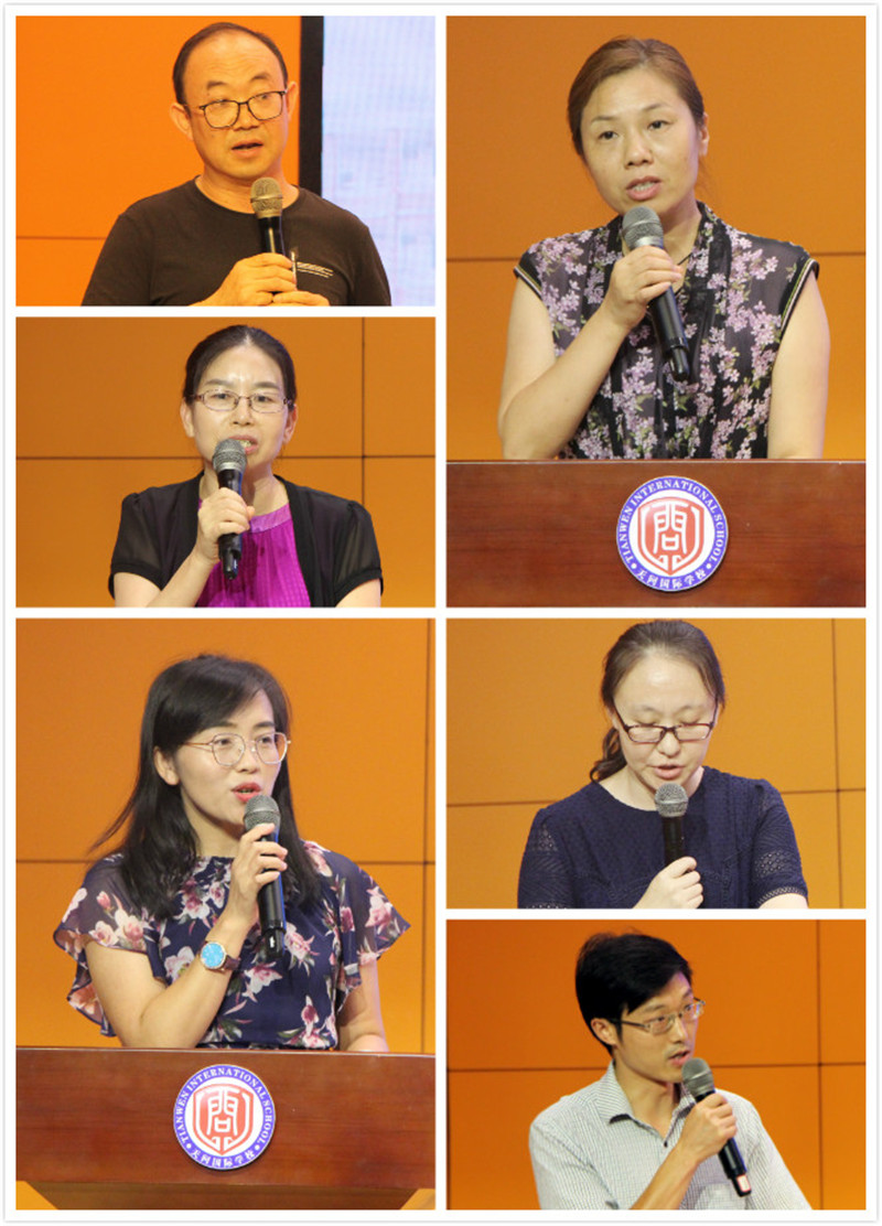 6位卓越个人和卓越集体的教师代表上台发言,讲述先进事迹的同时也介绍了他们在教育教学中的经验和做法。屈定香老师告诉我们,作为一名教育者,就要付出自己的耐心、爱心与真心;邱泽斌老师认为爱就是了解,就是尊重,爱才是教育的魂;而除了爱心,赵钢英老师用实际行动诠释了优秀的班主任需要的还有智慧与方法;作为年级组的带头人,王霞主任感恩全体教师的桴鼓相应与凝心聚力;物理组黄廷元老师用情地诉说了该组7位男子汉的豪气、义气与“傻”气;化生组王夏夏老师则讲述了她在团队中实现自我超越的点点滴滴。
