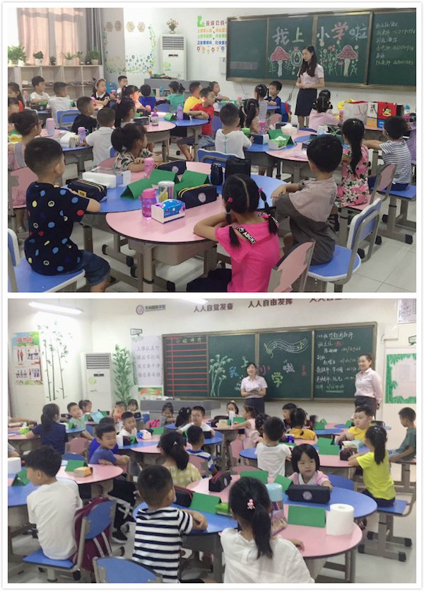 一年级的教室也盛装迎接小朋友们呢!一间间富有年级特色的主题教室、一张张摆在花瓣桌上的姓名卡,一株株挂在班牌上的水培绿萝,还有站在教室门口迎接孩子们的老师们,她们笑容可掬,温柔可人,有条不紊地接待前来报到的孩子们。