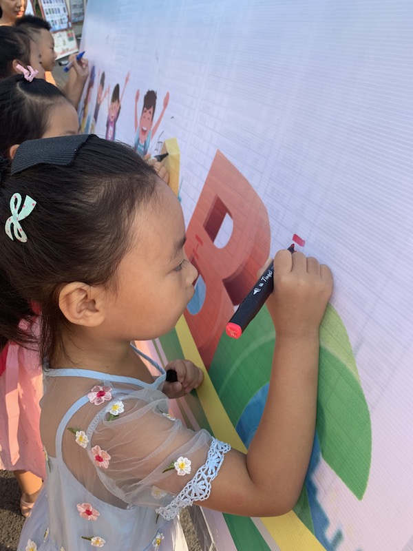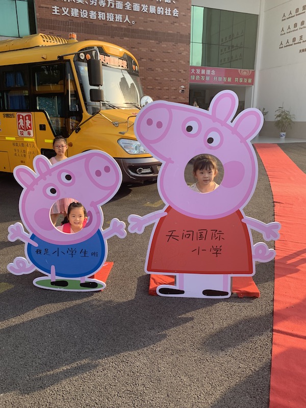 走过崭新的红地毯,就是醒目的签名墙,“我是小学生啦”,多么富有童趣的背景,新生们在爸爸妈妈的帮助下拿起了签字笔。他们有的让妈妈抱着,有的骑在爸爸脖子上……各种笔迹,各种姿势,只为郑重地签上了自己的名字。签名完后,小朋友、家长又忙着与小猪佩奇和乔治合影,孩子们纷纷感叹”太有趣啦“!