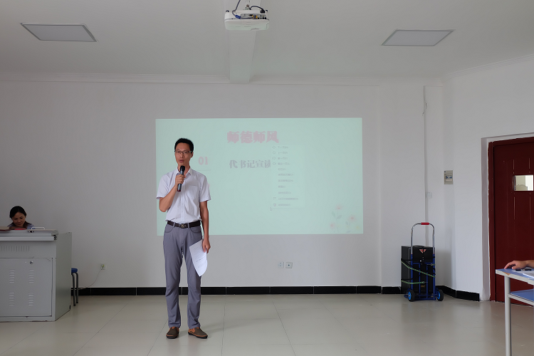 国将兴,必贵师而重负。我们作为一名老师在感受学生对我们尊敬的同时也要遵守师德师风,今天,天问教育集团党总支书记戴德凯先生为我们宣读集团文件,并和高新校区党支部书记韩亚飞老师共同为“师德模范”官宇丹老师颁奖。
