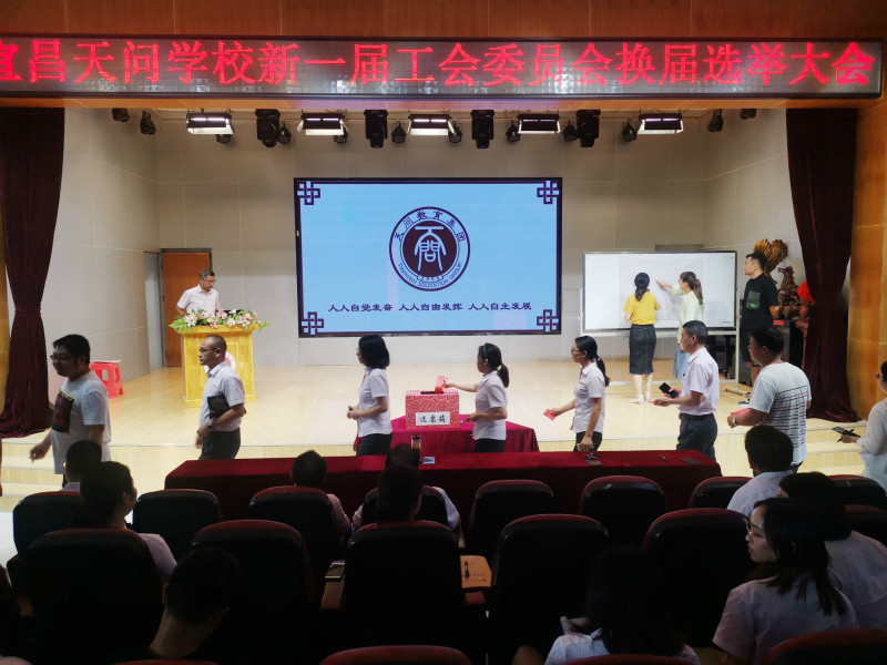 近日,天问书院校区召开了新一届工会换届选举大会,书院初中部、小学部共计75名教师参加了会议。会上,按照《选举办法》的流程,通过无记名投票、计票、监票等程序,最终选举陈飞担任新一届工会主席,龚永兰、段智慧为新一届工会委员。
