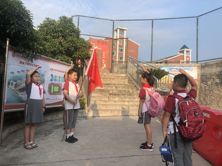 新一届少先队大队委及各班中队委带着责任与众人的期望开始了他们全新的征程。各中队开始在校门口值日,他们按时到岗,精神面貌极佳。在值周同学及值周老师的引导下,学生们戴好了红领巾、微笑行队礼、主动打招呼。