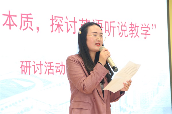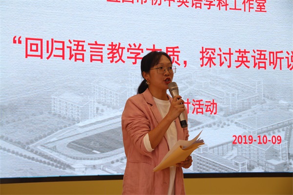 在此次研讨会的最后,黄教研针对今后英语听说教学如何开展给出了指导性建议。她说天才是听出来的,语感是读出来的,高分是译出来的。首先,教师需要遵循语言教学规律,先大量输入再输出,体现语言的交际原则。其次,课堂上要坚持因材施教,分层教学,分层设置目标,让每一位学生都能有所获。同时,课堂研究应由研究教师的“教”转向研究学生的“学”,要注重信息技术与教学的深度融合,与时俱进,转变观念,注重英语的交际功能和文化功能,全面规划,让学生阶梯成长。最后,注重课内外的延展,将各种活动贯穿于课堂始终,开拓学生的视野。