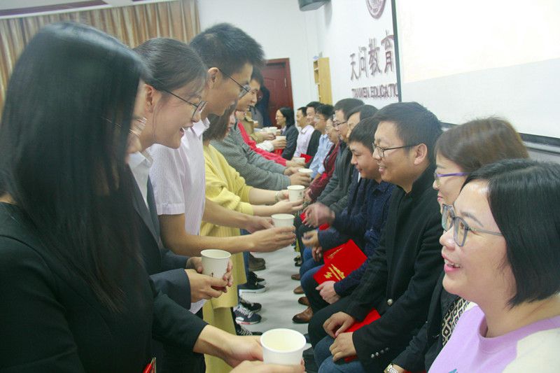 此次活动,总共促成16组新老教师师徒结对,在现场,徒弟们纷纷向师父敬茶,一是表明对师父的敬意,二是表明努力快速成长的决心。